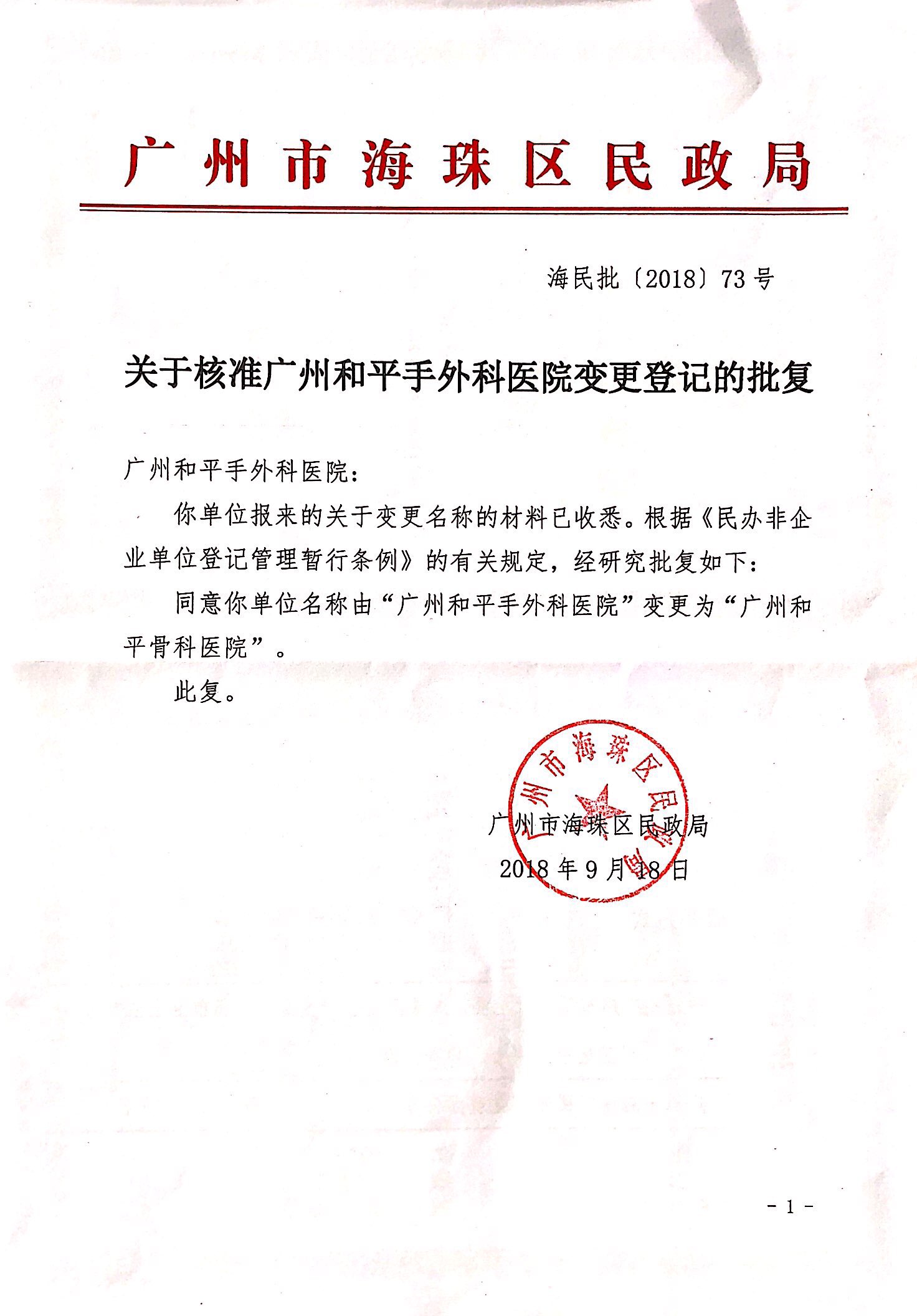 经广州市海珠区民政局核准批复,广州和平手外科医院名称变更为“广州和平骨科医院”。请周知。