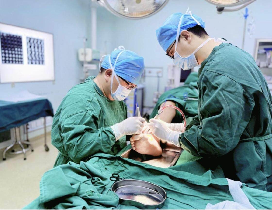 鉴于阿轩全身痛风石数量多、分布广,且部分已经侵蚀骨质,张建主任团队经过详细评估,为他制定了分期手术的治疗方案。首次手术主要清除右侧肢体痛风石,包括右肘部、右前臂、右足踇趾及第4趾、足背及足跟部痛风石,并对受影响的肌腱进行松解、修复。